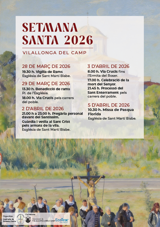 Setmana Santa 2026 a Vilallonga del Camp se celebrarà del 28 de març al 5 d’abril amb un conjunt d’actes litúrgics i tradicionals que tindran lloc en diversos espais del municipi.