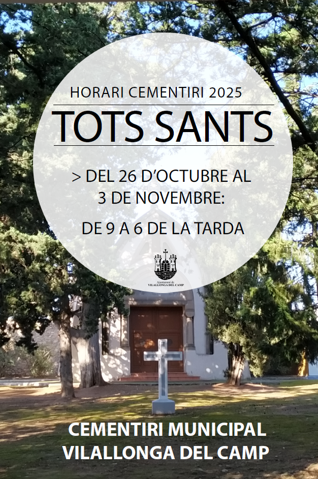 Amb motiu de la celebració de Tots Sants, l’Ajuntament informa que s’amplia l’horari del Cementiri Municipal per facilitar les visites de les famílies que vulguin retre homenatge als seus difunts. Del 26 d’octubre al 3 de novembre, el cementiri romandrà obert de les 9 del matí a les 6 de la tarda, de manera ininterrompuda.